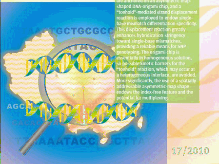 在此基础上,该合作组的张钊博士充分利用地图的不对称性和可寻址的特点,实现了无需编码索引而空间可寻址的液相DNA纳米芯片,并通过原子力显微镜技术实现纳米芯片的信号输出。同时,张钊等又通过在“中国地图”表面引入链置换反应,增加了DNA杂交过程的特异性,从而实现对单碱基变异性的高特异性分辨,这为基于单碱基多型性的遗传分析提供了一个新的纳米工具,相关论文已发表于纳米领域重要杂志Small (2010, 6, 1854-1858),并被选为当期的Frontispiece论文。