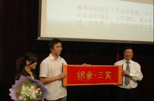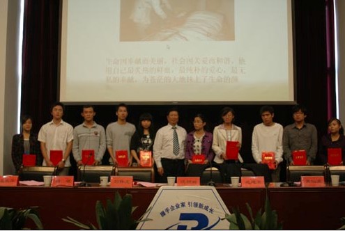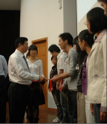 浙江银象生物工程有限公司董事长沈颜新亲自为获奖同学颁发了荣誉证书和奖金,沈总鼓励同学们志存当高远,与时俱进,学习上要有“独上高楼,望尽天涯路”的境界,把握机会,奋力迈向成功,同时牢记“做人实在,做事实干,做学问实用”,争做“三实”创新人才。
