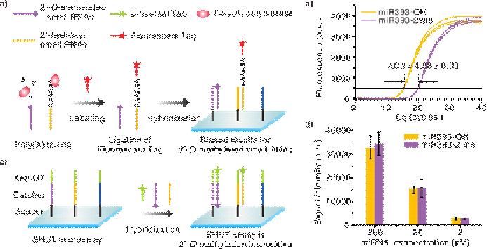 中科院苏州纳米技术与纳米仿生研究所李炯课题组继2011年在Nucleic Acids Research(链接)发表了首次实现常规小分子RNA(无修饰)的高通量非标记芯片方法后,进一步证实该方法也不受小分子RNA的3’末端甲基化影响,可以准确检测上述被修饰的小分子RNA(如图c、d);同时精确定量了商业化芯片中大量使用的Poly(A)聚合酶受3’末端甲基化的影响程度(甲基化小分子RNA的Poly(A)聚合酶反应效率约为常规小分子RNA的1/24,如图a、b)。