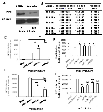 MicroRNA通过调控Pur-alpha的表达调节HIV-1在单核细胞/树突状细胞中的复制。A) Pur-alpha在单核细胞中低表达;B)Pur-alpha蛋白翻译受到MicroRNA的调控;C-F)利用MicroRNA调控Pur-alpha的翻译可以调节HIV-1在单核细胞(C,D)与树突状细胞(E,F)中的复制。