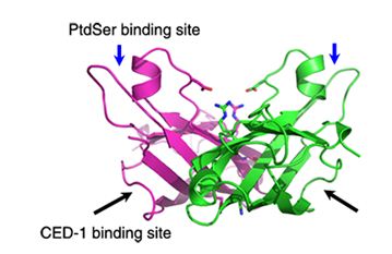 晶体结构显示,TTR-52分子形成一个开放的β桶结构,与含有8个β折叠片的β桶和β三明治结构都不同,TTR-52由7个β折叠片组成。TTR-52的C端因为缺少一个β折叠片,造成部分疏水核心暴露,这种独特的结构特征暗示其具有生物学意义。随后的体内和体外实验都证明,TTR-52利用该疏水区域与吞噬受体CED-1结合。此外,TTR-52的第二、第三个loop区域形成一个杯装的正电区,这和transthyretin很不同,却和其他PS结合蛋白如PKCα, TIM4具有类似之处。经过突变实验,研究发现TTR-52的这两个loop区域可以通过阳离子介导PS的结合,从而识别凋亡细胞;此外,晶体结构中还观察到TTR-52可以形成背靠背的二体,在该二体界面上进行突变可以将二体打开,但是该单体蛋白介导凋亡细胞吞噬的功能大大下降,该结果暗示由二体作为基本单元可能是TTR-52发挥功能的形式。