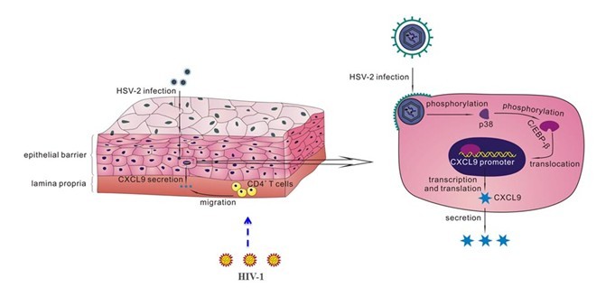 HIV-1(人类免疫缺陷病毒1型,即艾滋病毒)性传播主要感染黏膜下层的靶细胞如CD4+ T细胞,而同为性传播相关病毒的HSV-2(人类单纯疱疹病毒2型)则主要感染黏膜上皮细胞。流行病学数据显示,HSV-2患者感染HIV-1的机率增加,但分子机制不明。胡勤学学科组研究发现,HSV-2感染人宫颈上皮细胞后能激活p38-C/EBP-β信号通路,促使转录因子C/EBP-β结合到CXCL9启动子上诱导表达趋化因子CXCL9,诱导产生的CXCL9能够招募HIV-1靶细胞CD4+ T细胞。研究人员据此提出了HSV-2感染招募大量CD4+ T细胞至黏膜感染部位,从而增加HIV-1性传播的潜在分子机制。