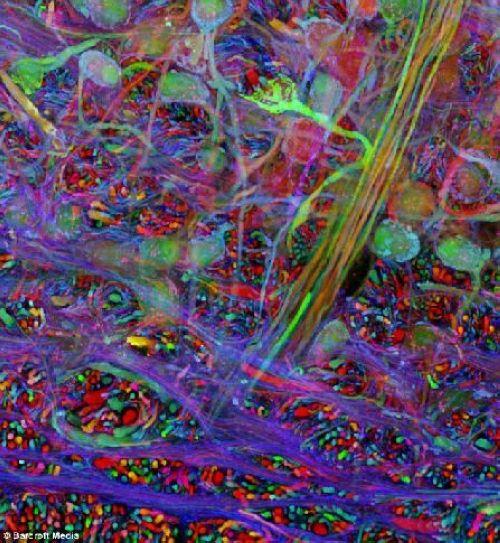 他通过运用三种颜色,一种特定的颜色跟踪特定的神经细胞,来扫描它们的相互联系。用传统的方法,这项工作将耗时数千年之久。