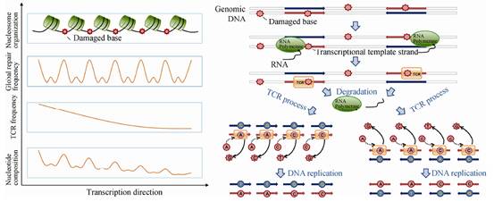 此外,他们通过研究12种类型的核苷酸突变频率,发现C→T,A→G,C→G,和G→T是人类基因组的四种主要转录突变类型。同时,研究也表明,突变修复率从转录本的5′端到3′端呈下降趋势,并且下降幅度与基因表达水平相关,这可能与转录偶联的DNA分子修复过程(Transcription-coupled DNA Repair,TCR)有关。最后,研究还提出人类基因组遗传变异的周期性应该是核小体定位和TCR作用的共同结果。