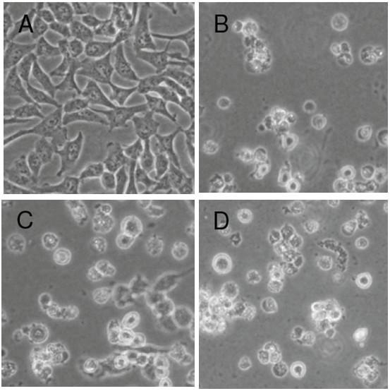 图:RD细胞经不同处理后的细胞形态(A)正常RD细胞;(B)野生型CVA 16 感染后的RD细胞;(C)体外转录RNA转染后的RD细胞;(D)CVA16拯救病毒感染后的RD细胞。